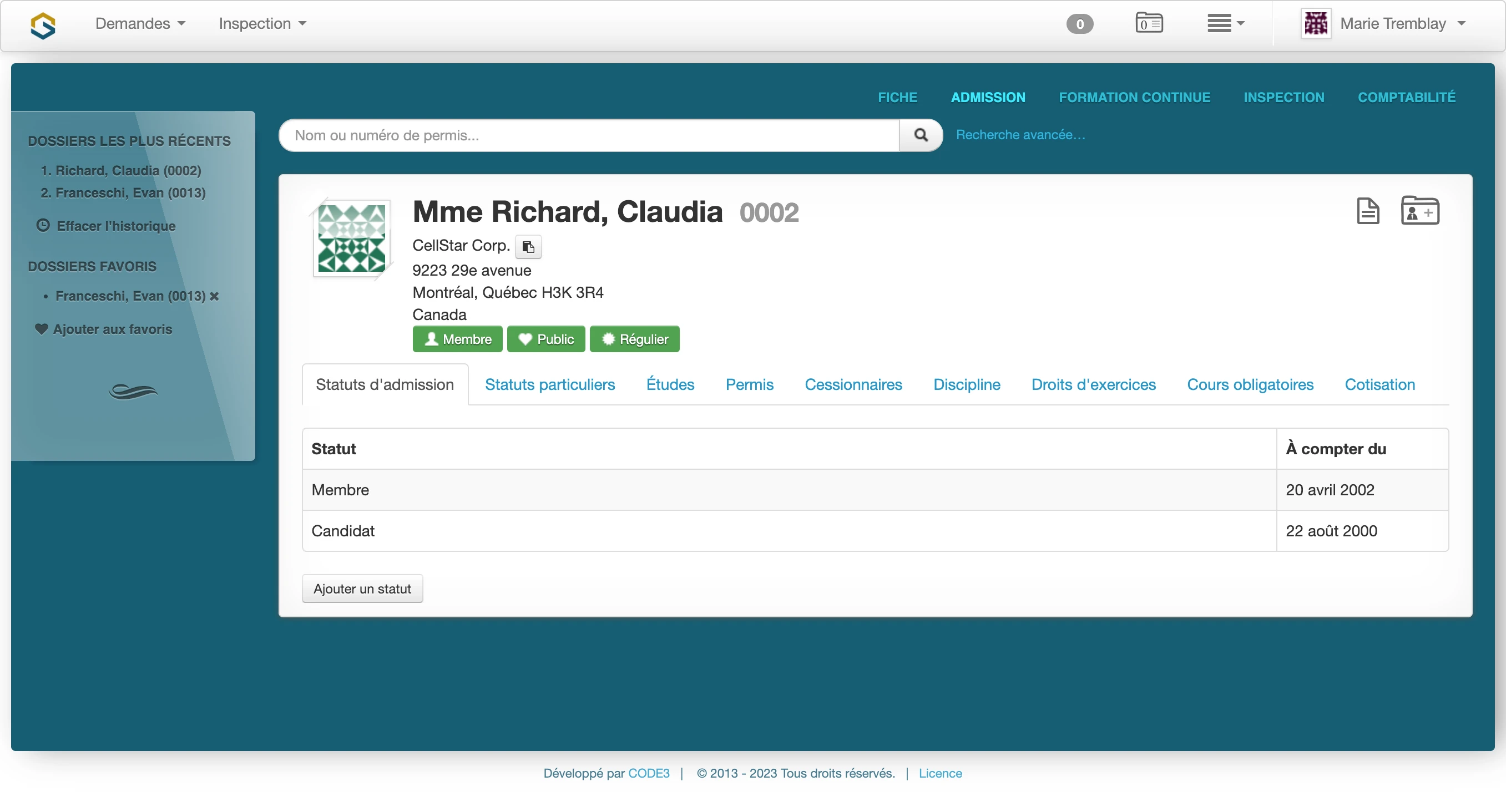 Ce module gère les processus d'inspection des membres, incluant la planification, les rapports et le suivi des recommandations. Grâce à lui, vous pouvez garantir la conformité et le suivi efficace au sein de votre organisation, contribuant ainsi à la protection des intérêts de la profession. Il offre des fonctionnalités avancées pour une gestion optimisée de vos inspections, vous permettant de maintenir des standards élevés de compétence et d'intégrité au sein de votre organisation.