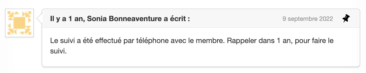 Programmez des rappels pour des échéances importantes ou des actions à entreprendre concernant les membres. - Notes